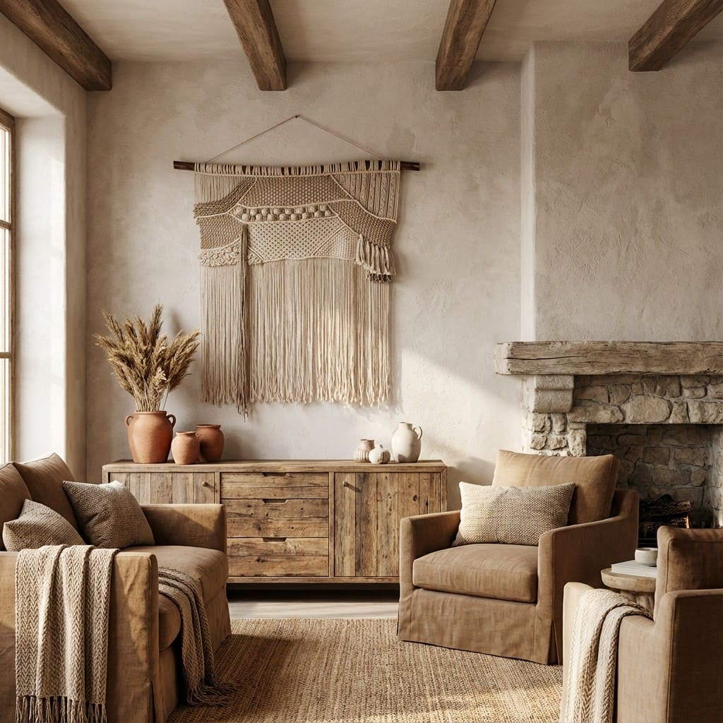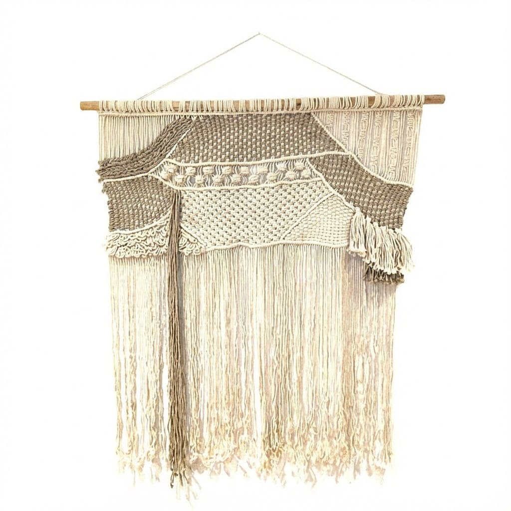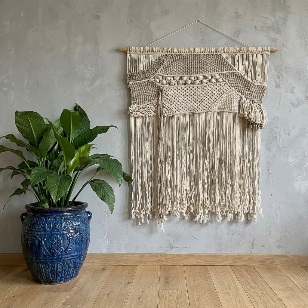 Un’opera sospesa, dove l’arte del macramè incontra la semplicità dell’essenziale.