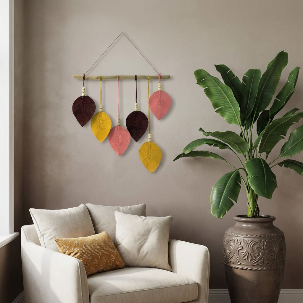 Una lunga decorazione in macramè, composta da tante foglie cucite a mano su un ramo naturale che formano un’intera chioma che danza nell’aria.