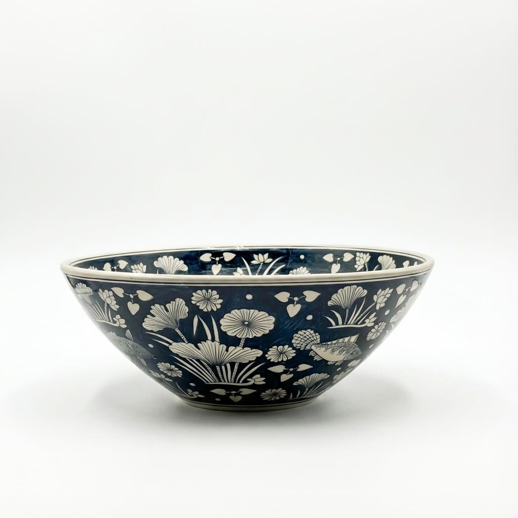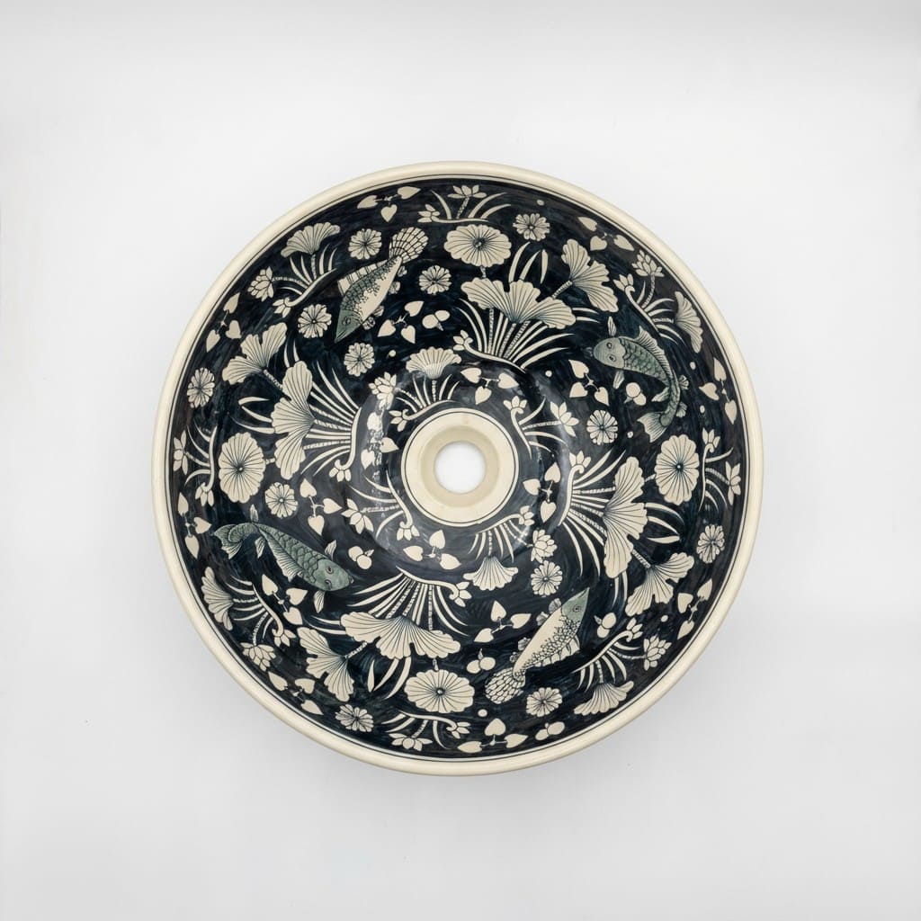 Lavandino in ceramica dipinto a mano con motivi ispirati ad un acquario, gioca con le sfumature di un unico colore per creare un effetto delicato e sofisticato. Un design che unisce arte e tranquillità trasformando l’ambiente in uno spazio di armonia e bellezza.