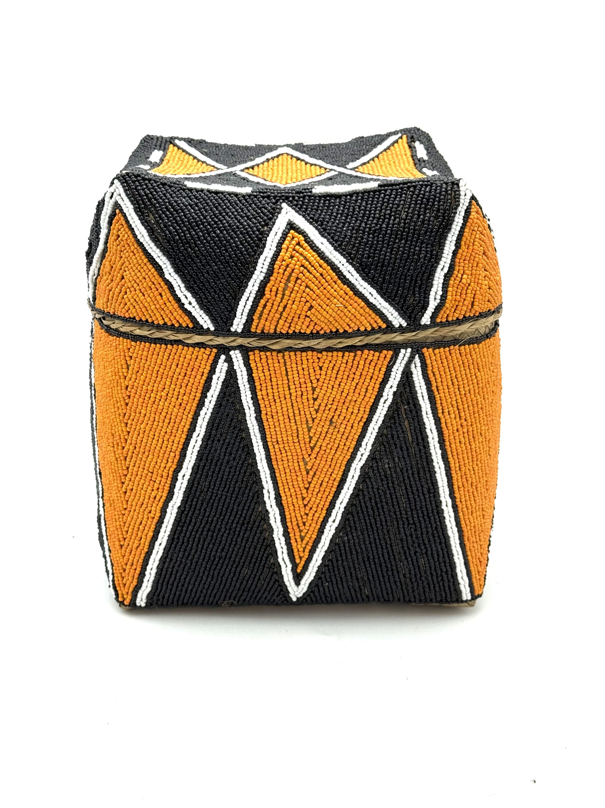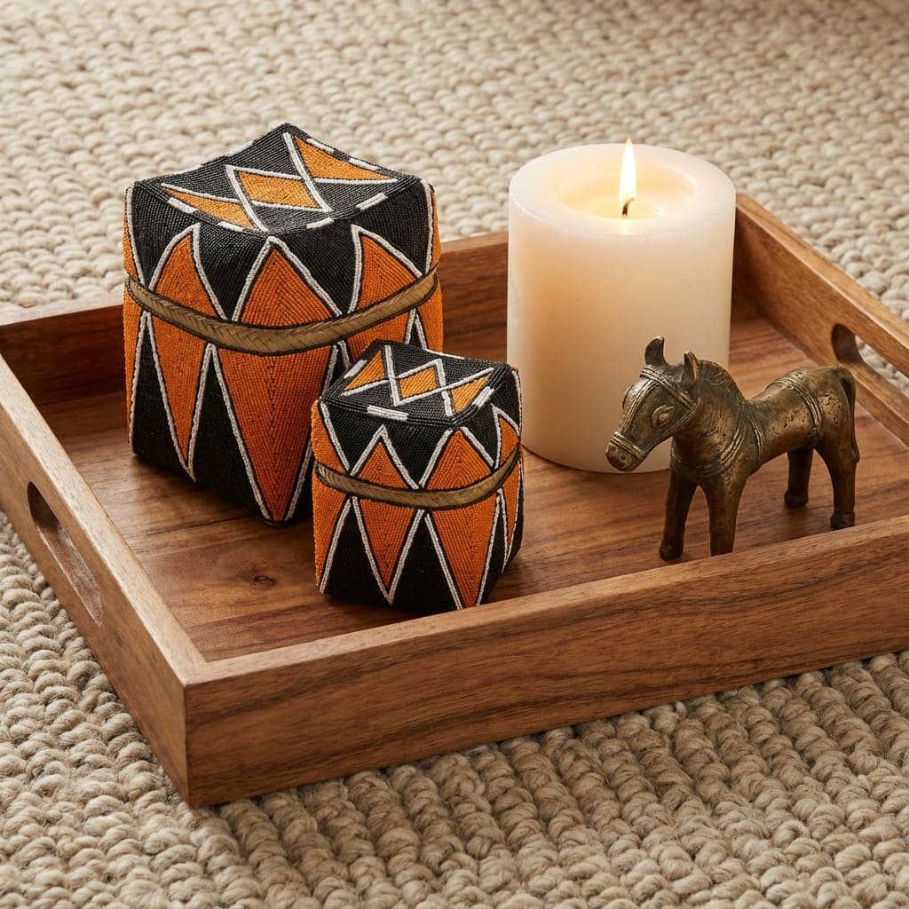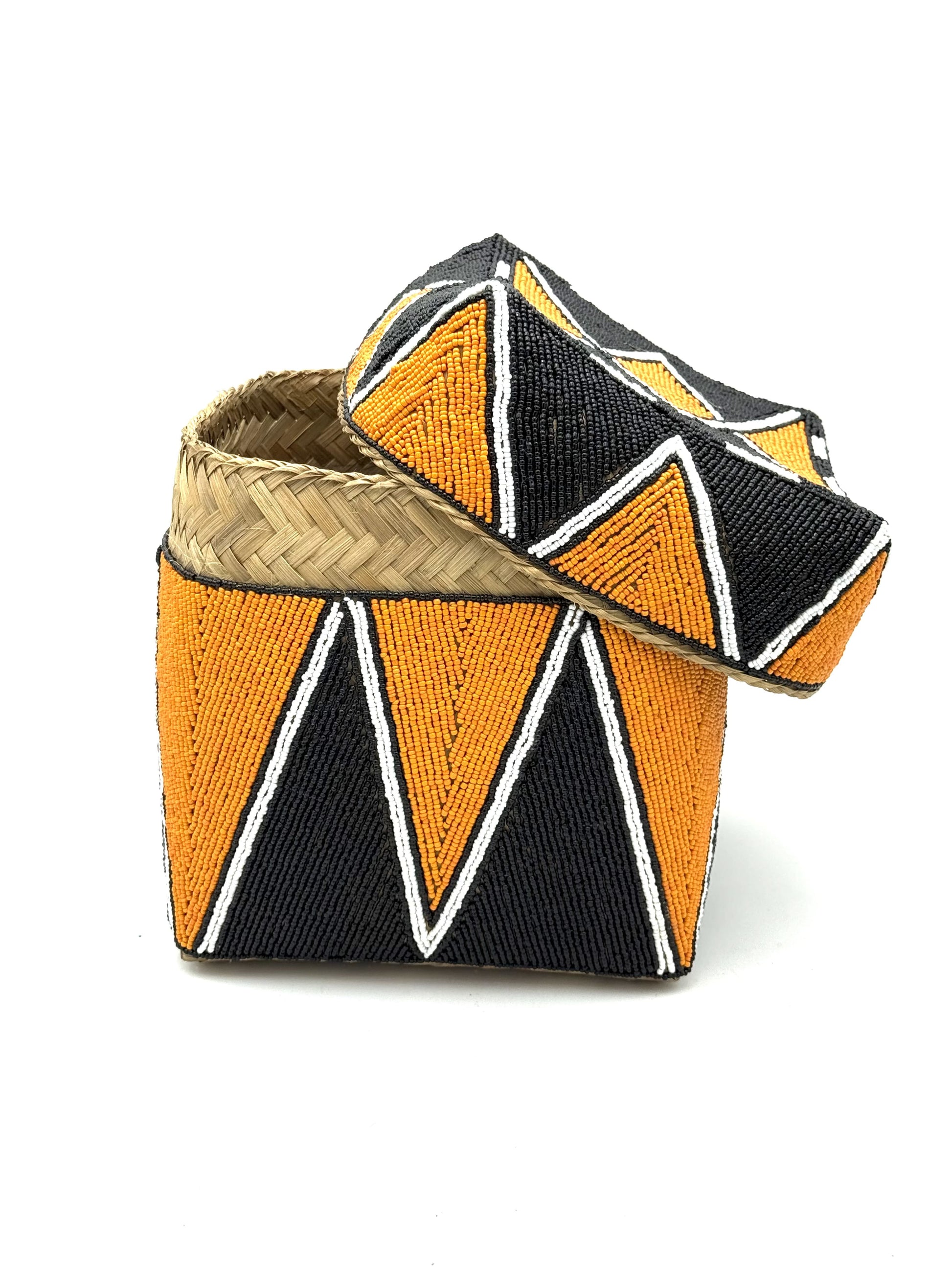 Realizzate in bambù intrecciato e interamente rivestite da perline applicate a mano, queste scatole custodiscono bellezza dentro e fuori.