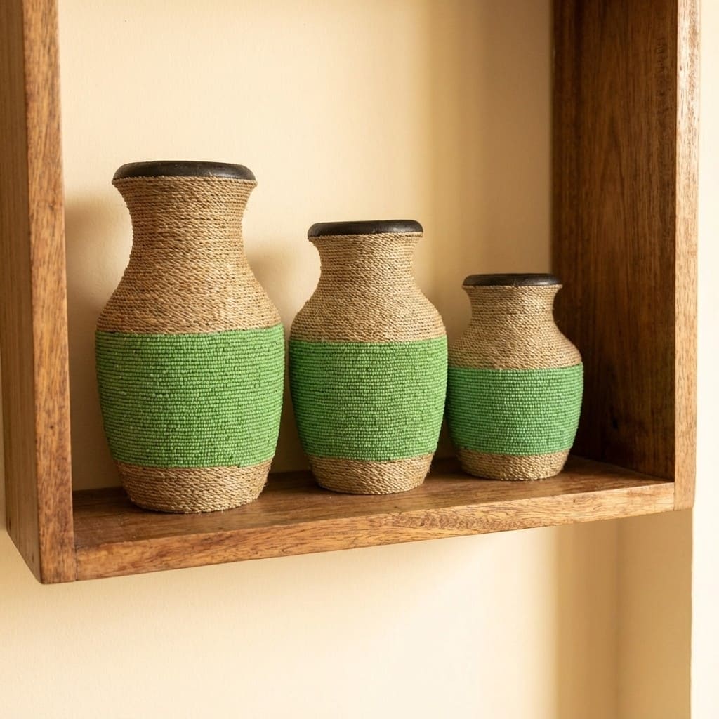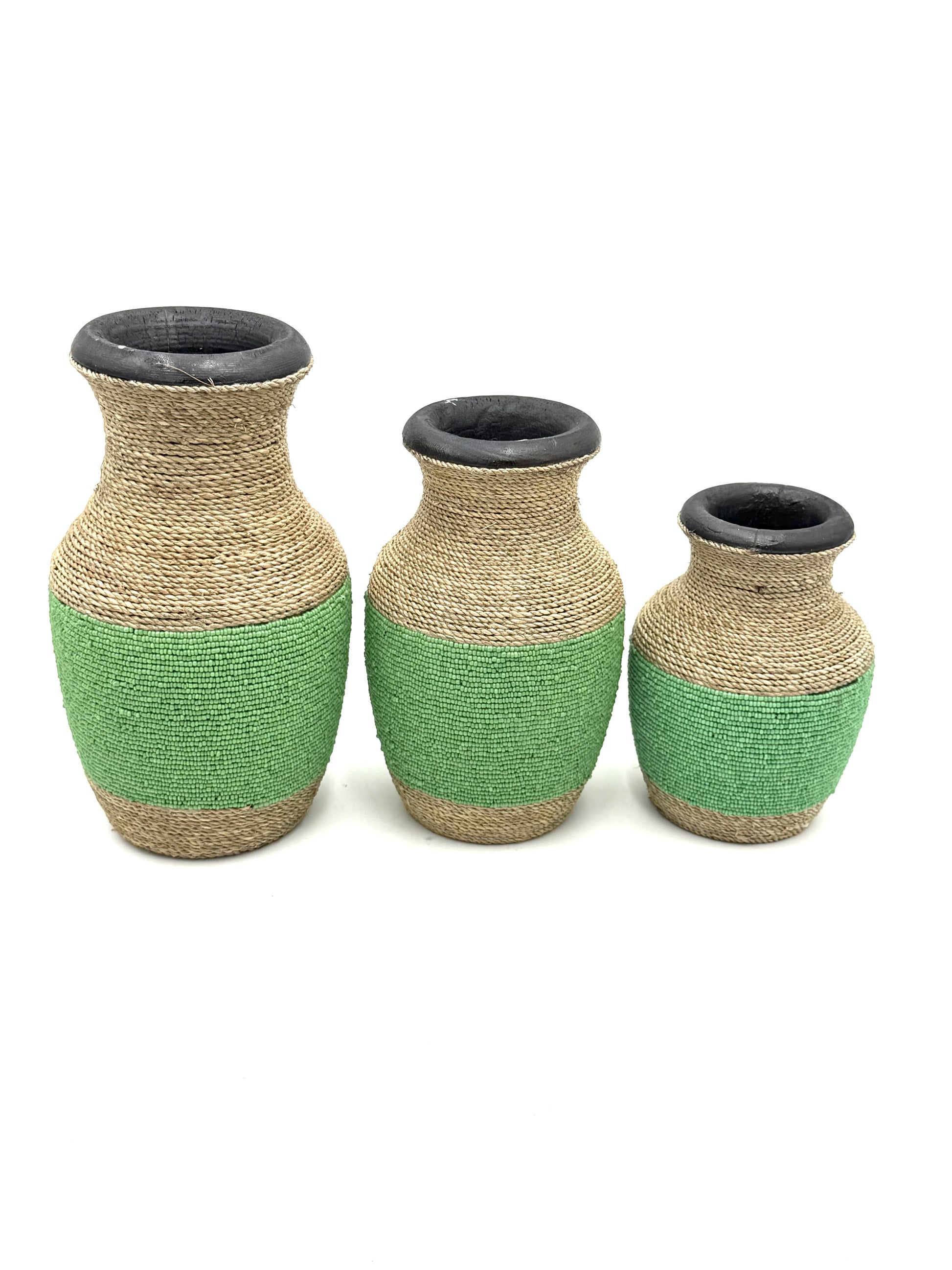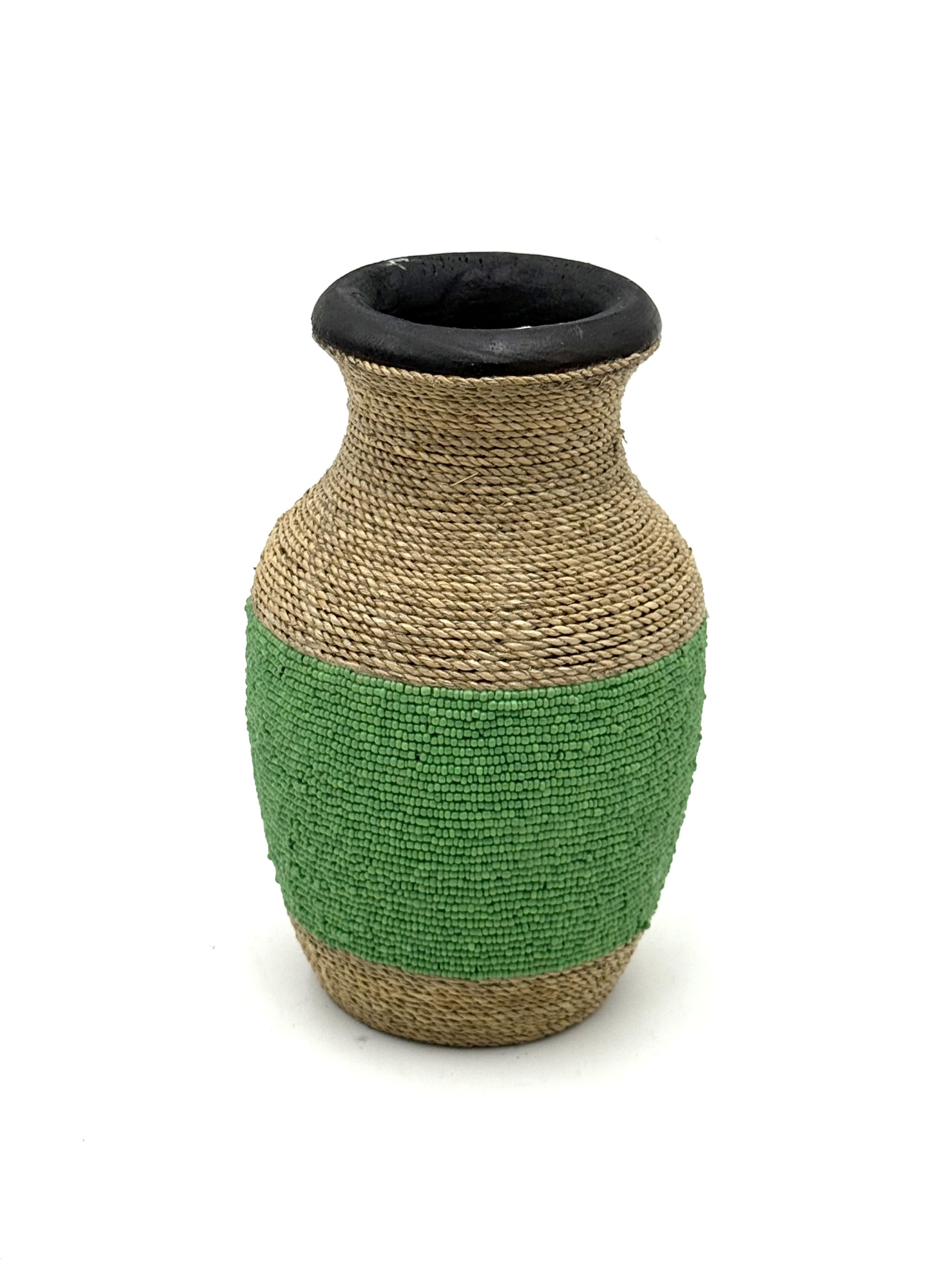 Un vaso ornamentale che unisce la forza semplice del legno alla delicatezza di finiture artigianali. Il corpo principale è interamente lavorato in pregiato legno naturale. Il collo è avvolto da una corda naturale, grezza e autentica, che accoglie una cascata di perline verdi.